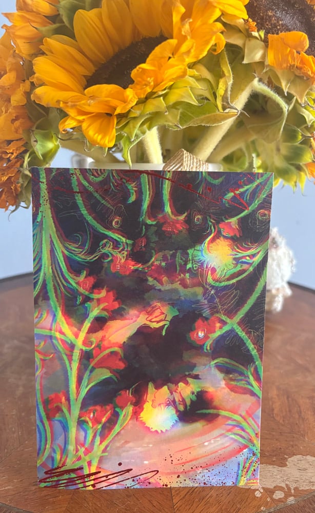5x7 inch postcard size prints featuring satoru gojo and suguru geto from jjk, with red foil detailing! prints have a matte finish