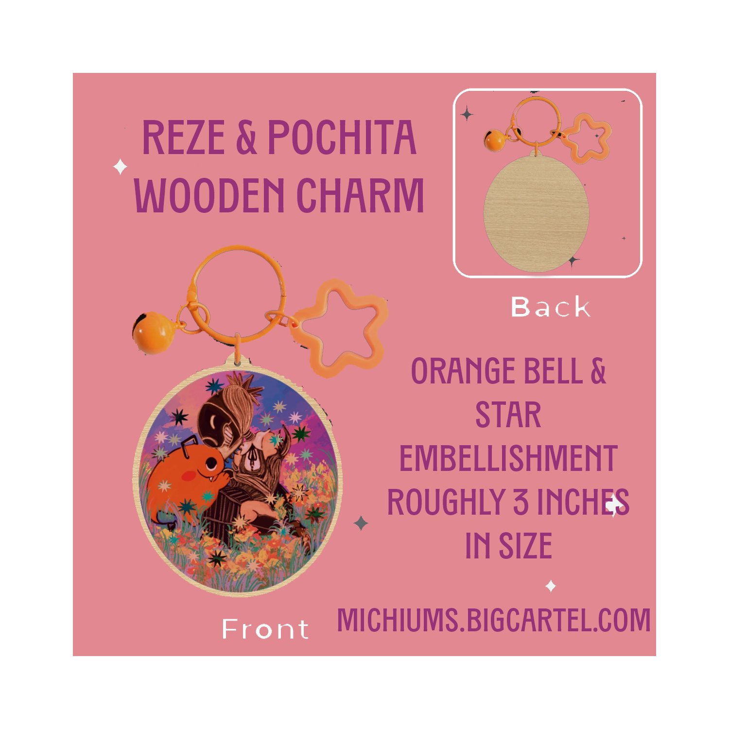 we'll run far far away together.wooden charm design featuring reze and pochita in a field of flowers, with a orange bell and star embellishment. charm measures roughly3 inches in size!
