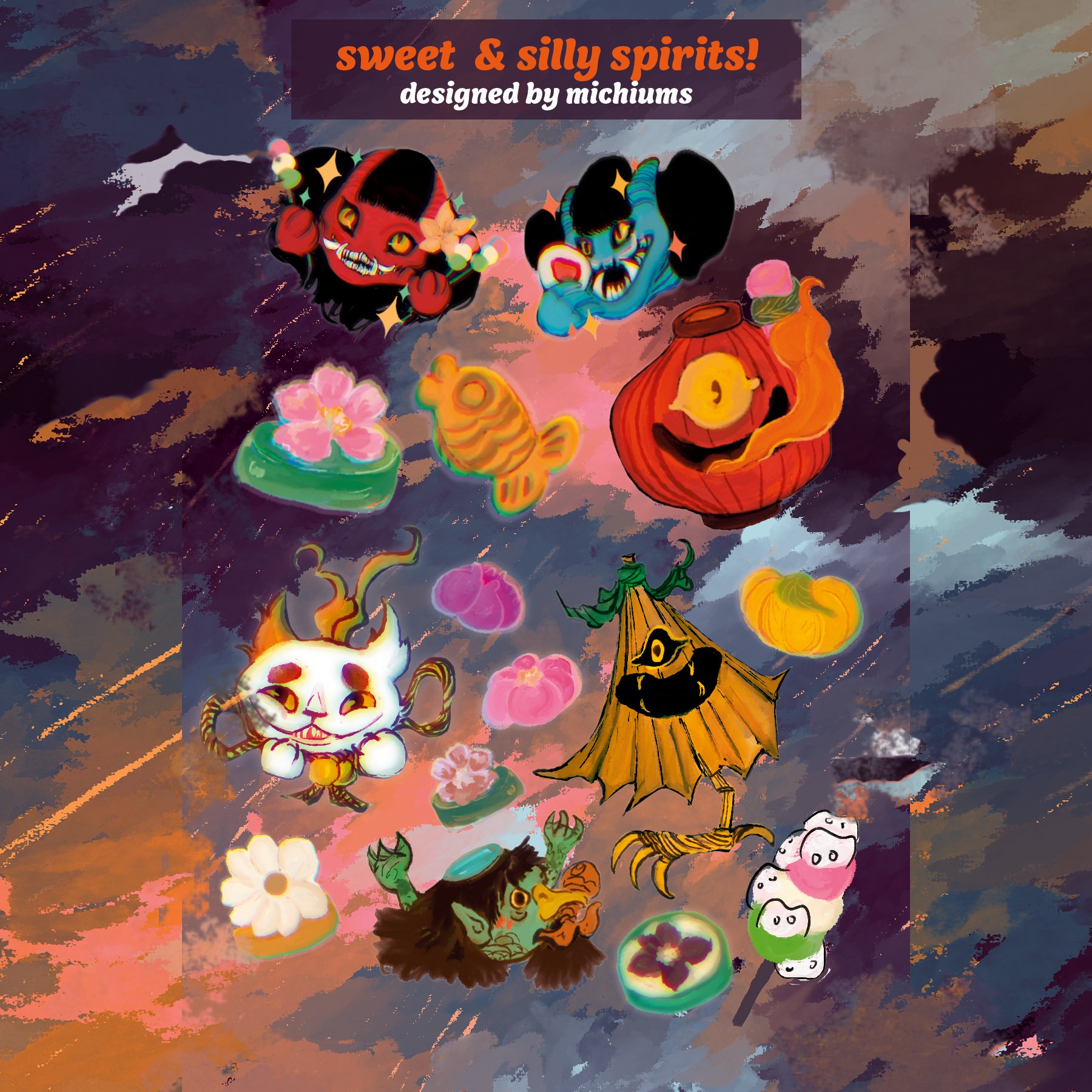 **please note, this is a preorder item, sticker sheets will ship out late October 2025!** a 4x6 inch sticker sheet featuring a variety of spirits and treats based off of Japanese folklore! 15 stickers, vinyl with matte finish, water/weather proof!