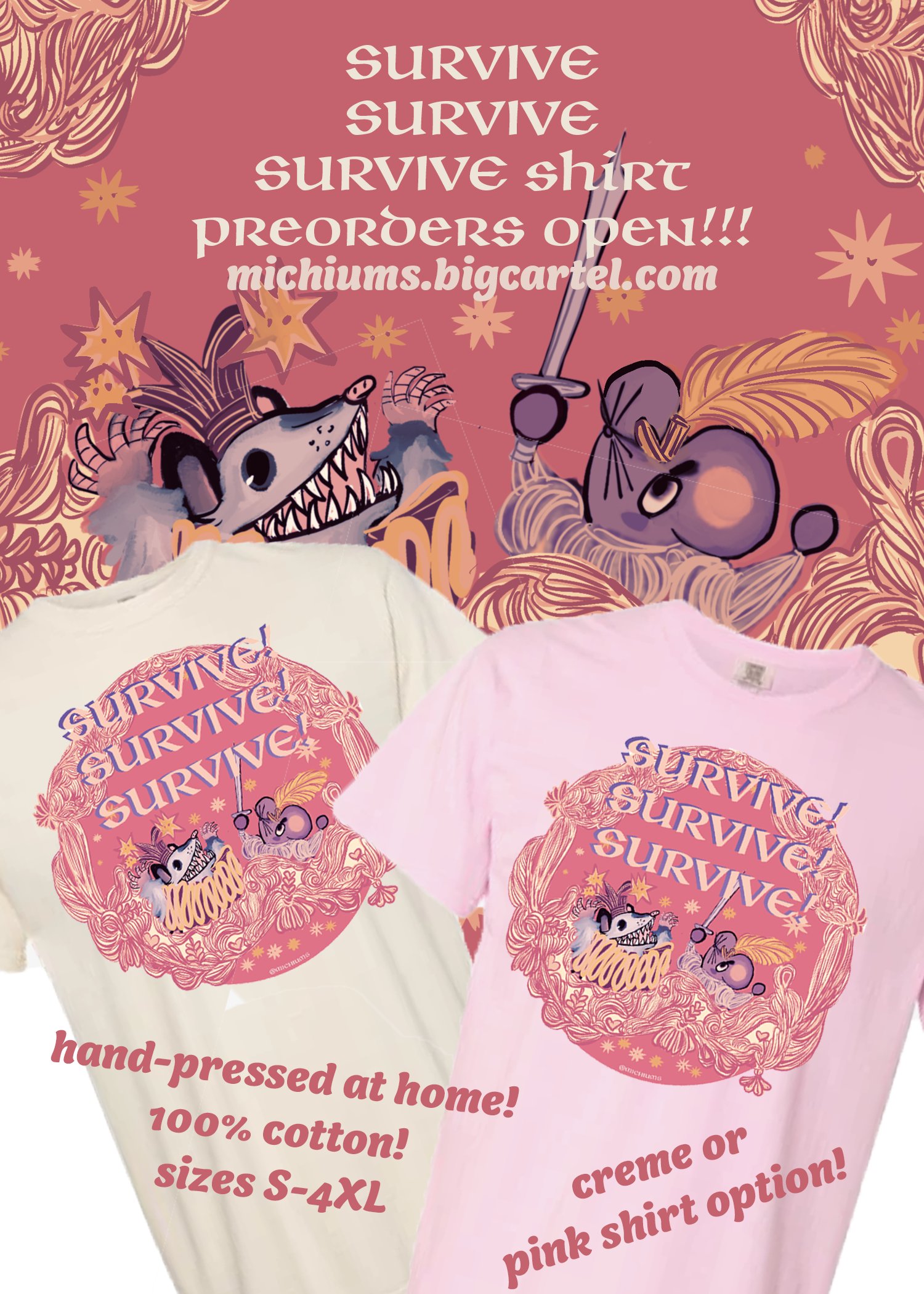 featuring RAT KNIGHT and POSSUM JESTER, these silly little critters are reminding you to SURVIVE SURVIVE SURVIVE amidst the horrors. 100% cotton shirts, with a 1-inch ribbed collar and top-stitched neckline! All shirts are hand-pressed at home and have slight variations in terms of how the design will come out!