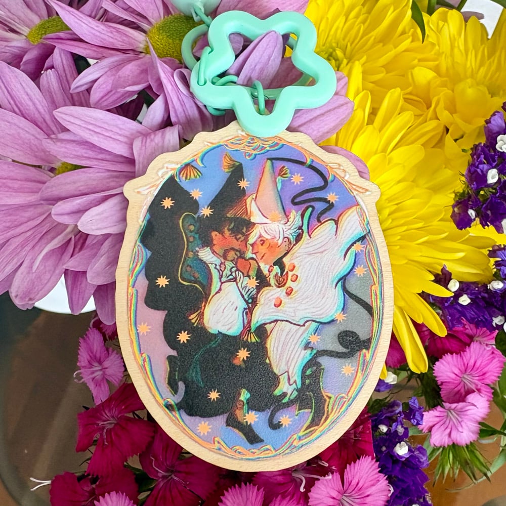 a roughly 3 inch wooden charm featuring qifrey and olruggio from witch hat atelier !